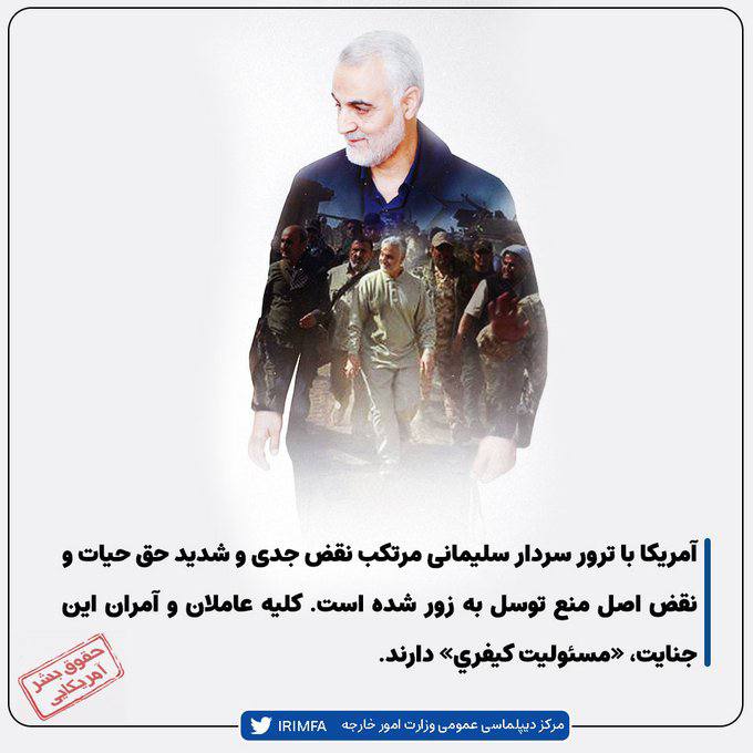 وزارت امور خارجه با انتشار توبیتی در حساب فارسی خود به مناسبت هفته حقوق بشر آمریکایی، نوشت: «آمریکا با استفاده ابزاری از دو مفهوم حقوقبشر و مقابله با ترویسم، دست به حذف فیزیکی بزرگترین قهرمانان مبارزه علیه تروریسم زده است که نمونه متاخر آن، ترور ناجوانمردانه سردار سلیمانی توسط دولت آمریکا در سال 2020 میلادی است».