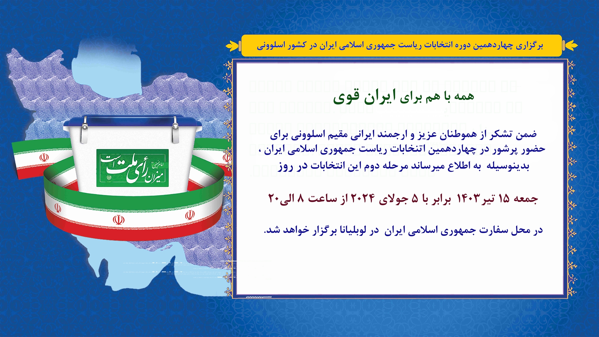 ضمن تشکر از هموطنان عزیز و ارجمند ایرانی مقیم اسلوونی برای حضور پرشور در چهاردهمین دوره انتخابات ریاست جمهوری اسلامی ایران بدینوسیله به اطلاع می رساند مرحله دوم این انتخابات در روز